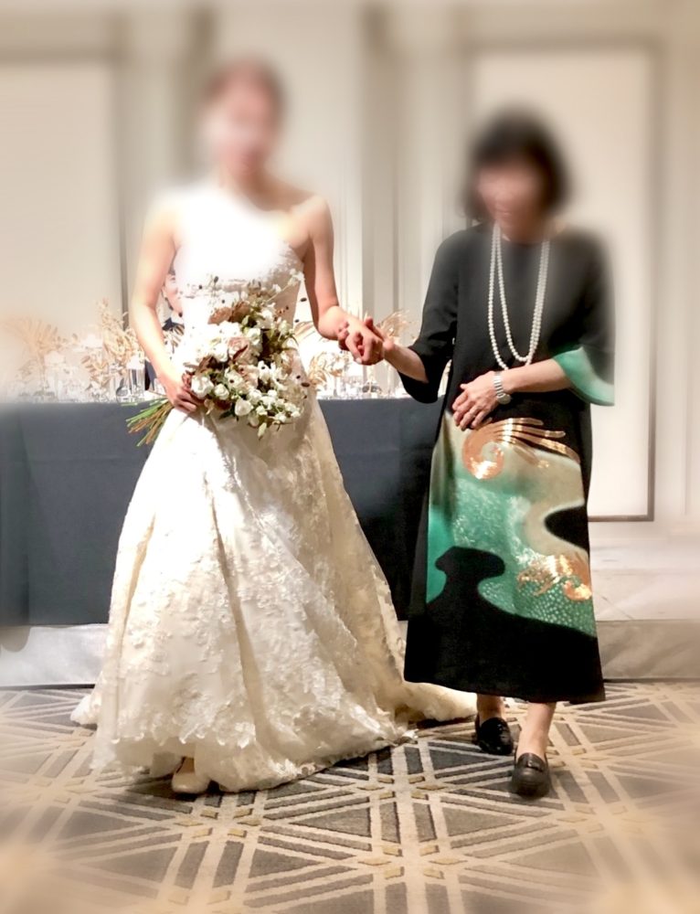 お母さまの洗い張りされた留袖と帯から、お嬢さんの結婚式に着用されるドレスとクラッチバッグ等をご依頼いただきました(以前のイベントチラシからのお問合せでした)